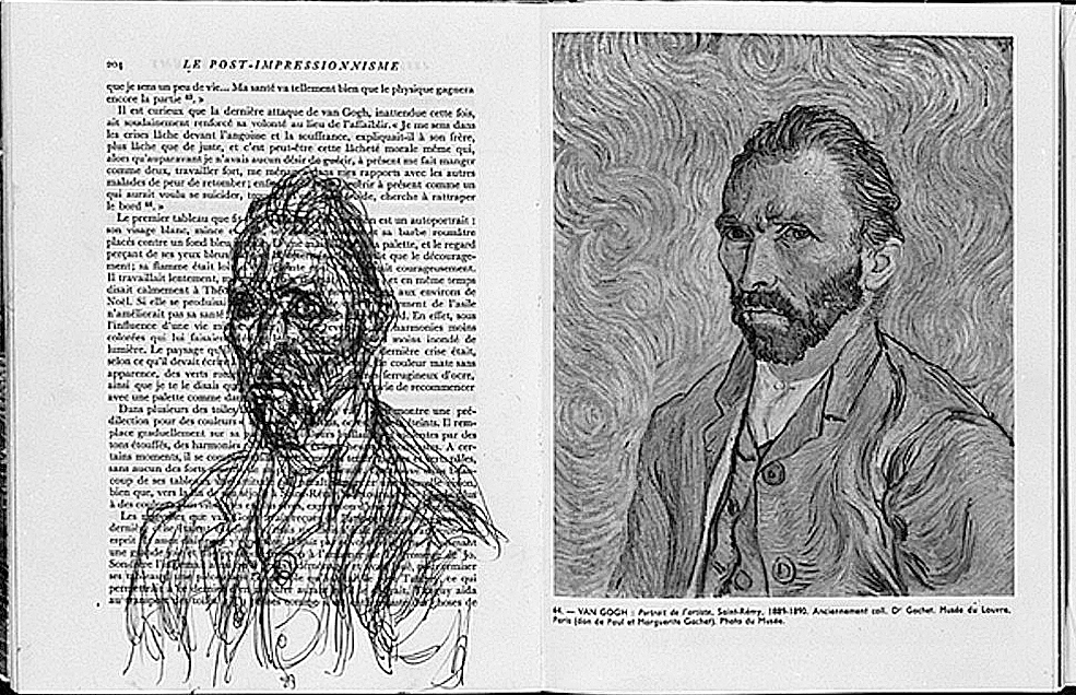 Daaronder een portret van Van Gogh door Alberto Giacometti, met pen en balpen nagetekend in een boek.